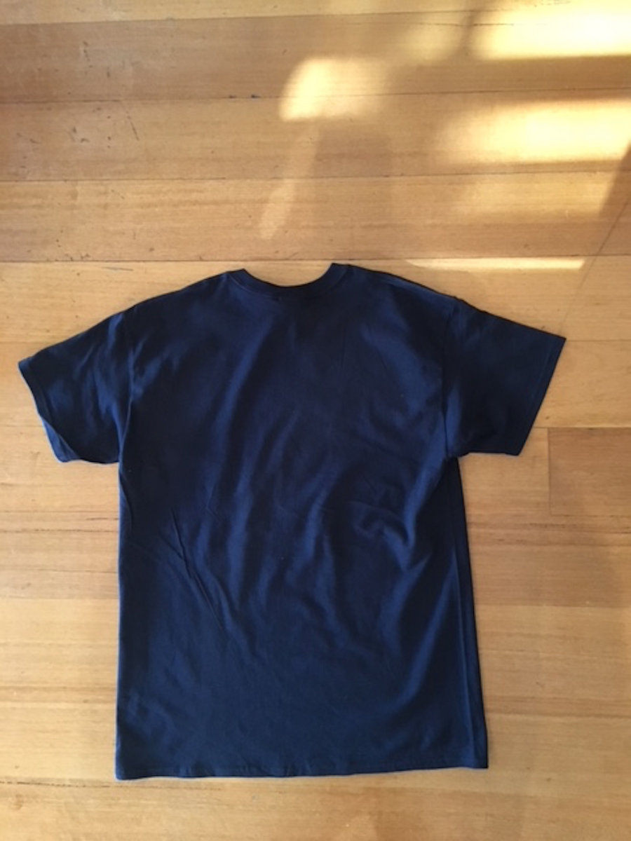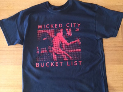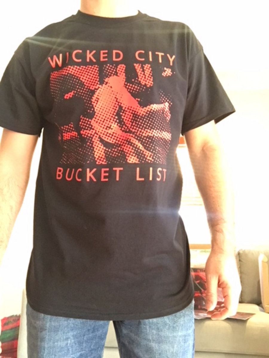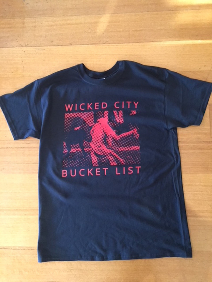 Bucket List album artwork printed Red on Black Gildan 100% cotton tear away model T-shirts. Plain back.